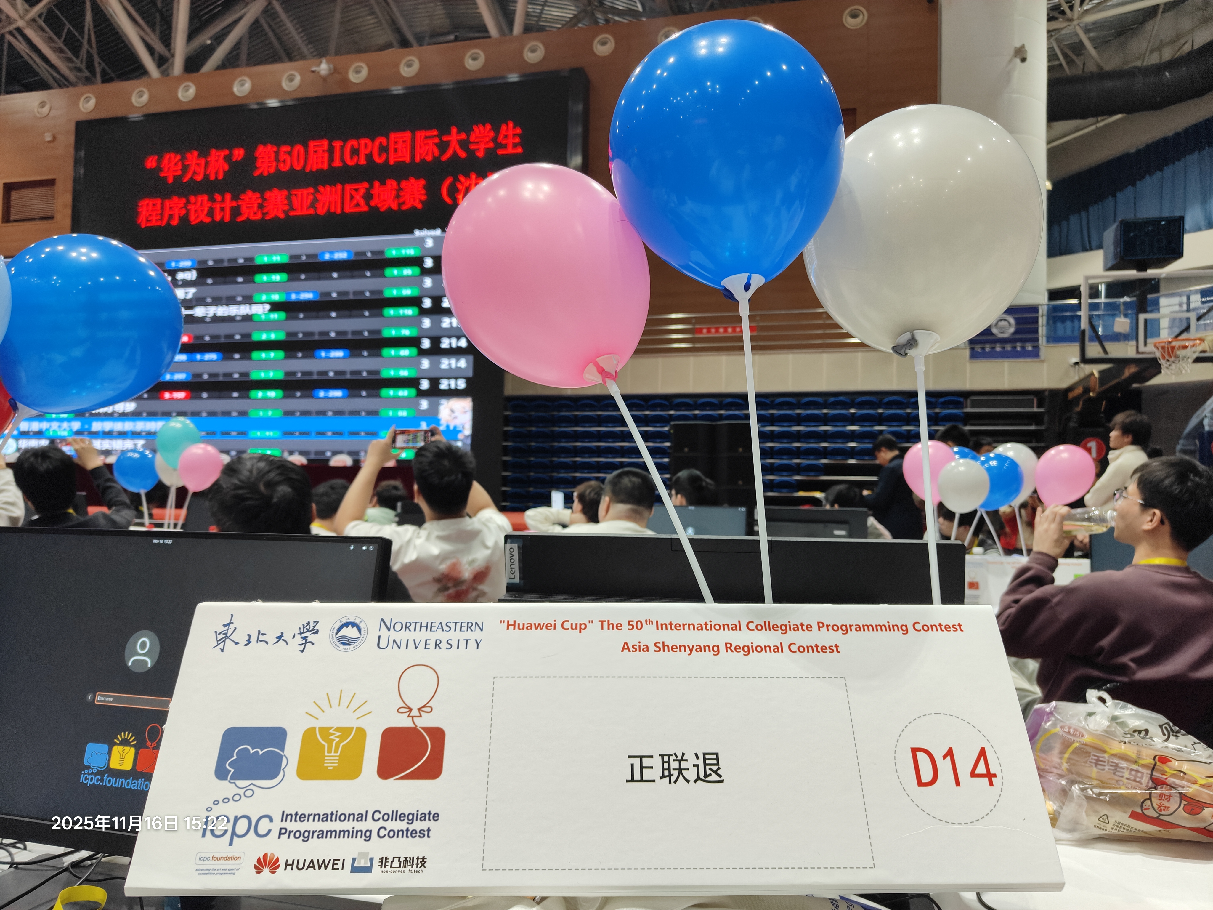 十一月中旬沈阳的天气几乎和天津差不多,没有想象的那么冷。到沈阳第二天就是辽宁省省赛,只是来玩一玩,就当区域赛的热身赛打了,按照 lhw 的话来说就是“来 gank 省内的队伍了”。最后也是所有队伍排名 rank9 ,但是银牌,主办方把省内外分开排名的。领完区域赛的物资之后,主办方那边给我们打电话说把教练的物资还回去,下次知道填报名表一定要填教练到场了。第三天区域赛正式赛,前两个签到做的都很快,第三个签到 wa 了四五次好像也问题不大。然后我们就又遇见了一个神秘 guess 题,题面是给了 $n$ 个犯病的青蛙乱蹦,最后问你最后一个跳跃青蛙的编号。三个人在那看了一两个小时也没想出来怎么做,旁边的金牌队更是交都没有交,甚至还能偷听到他们在非常礼貌问候出题人的家人。G其实是个计算几何,但是那个题的知识点我恰好没学过,怪我没学过闵可夫斯基和,赛后补题才发现原来这个题也太板子了。最后也是被青蛙拖了节奏,hsw 他们做 F 到最后也是没做出来。最后 3 题凭借罚时优势遗憾打铜。AF其实都能做,只是被 K 卡了,下次知道该放的就放了。